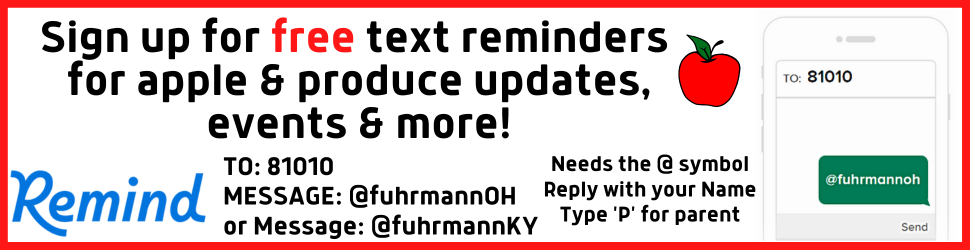 Apples are sorted into #1 Fancy Grade, #2 Utility Grade (smaller apples, slight blemishs), washed ciders, and Deer/Livestock. We sell our apples in various size bags; 3lb, 5lb, 10lb Peck, 20lb Half-Bushel, 40lb Bushel, and Ciders by the bin (18 bushel). You can purchase our apples at the orchard in Wheelersburg, OH Monday-Friday 9am-6pm and Saturday 9am-3pm, at farmers markets (Portsmouth, OH, Ashland, KY, & Columbus), The Wild Ramp in Huntington, WV, and Minford IGA & Westside IGA.